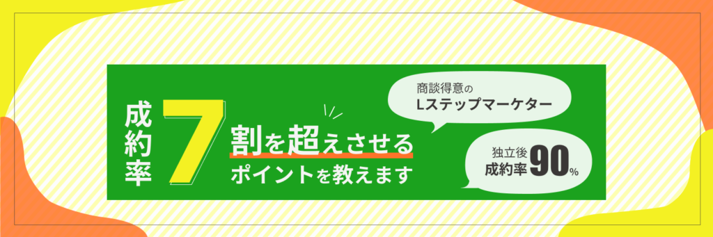 背景にはクライアント様の勢いやスピード感を表現するためにストライプを用いました。そして、笑顔が優しく話しやすい雰囲気に合わせて、丸みを帯びた図形も用いました。また、商談のプロ、Lステップのプロであることから、サブ文言にはLINEのトークをイメージした吹き出しを用いました。